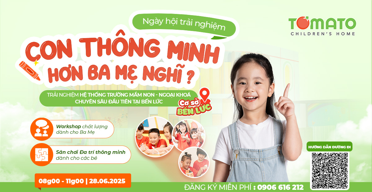 Với hơn 12 năm kinh nghiệm áp dụng phương pháp giáo dục hiện đại trong hành trình nuôi dưỡng và giáo dục trẻ giai đoạn mầm non - tiểu học và độ tuổi thanh thiếu niên, Hệ thống trường Mầm non - Ngoại khóa TOMATO lần đầu tiên sẽ đồng hành cùng ba mẹ tại Bến Lức Long An trong Ngày hội trải nghiệm: CON THÔNG MINH HƠN BA MẸ NGHĨ?