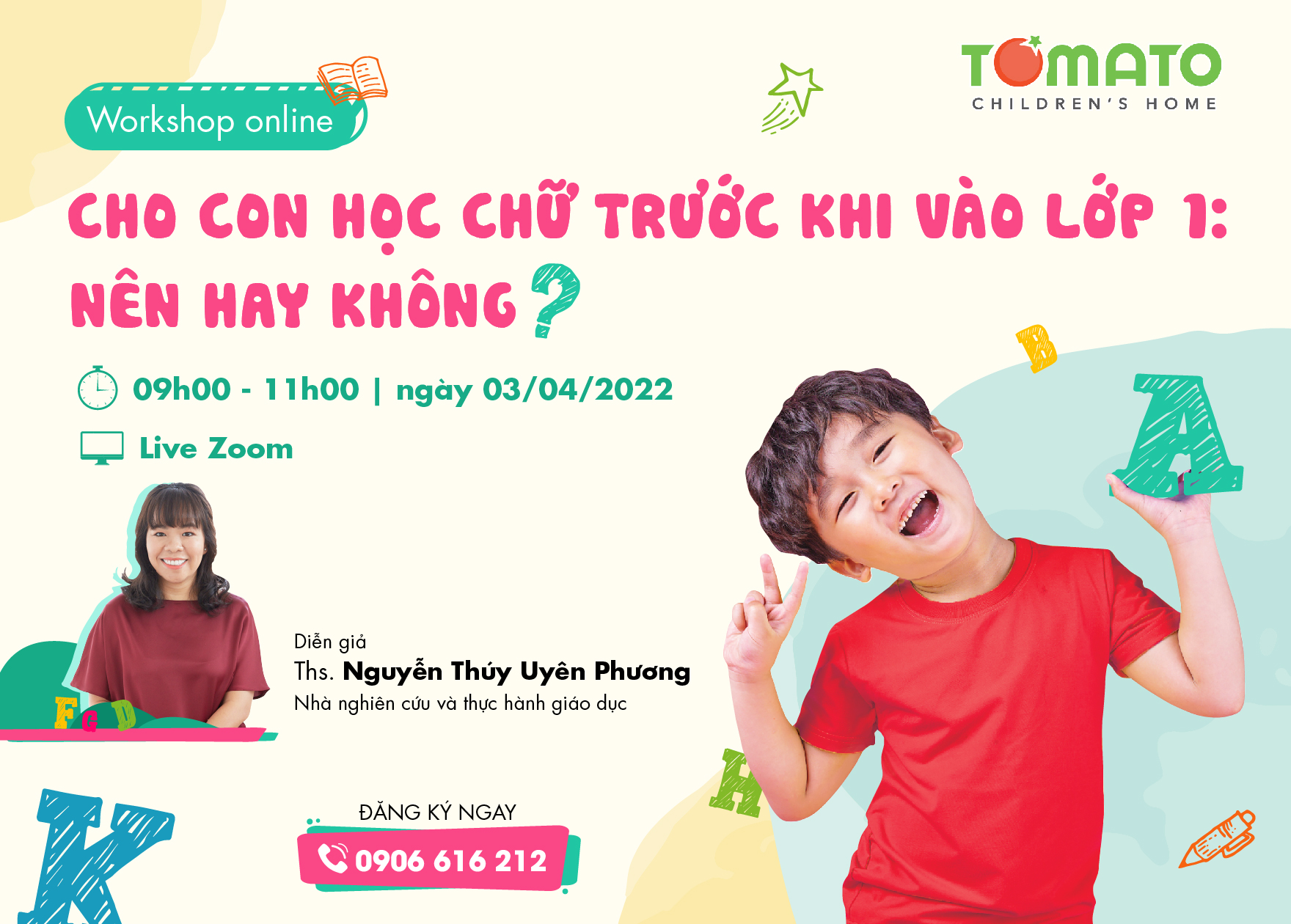 Thấu hiểu những trăn trở trên, Trường Ngoại khóa TOMATO Children’s Home tổ chức buổi Workshop Online "CHO CON HỌC CHỮ TRƯỚC KHI VÀO LỚP 1: NÊN HAY KHÔNG?". Đối thoại cùng các chuyên gia giáo dục dẫn đầu trong lĩnh vực nuôi dạy trẻ tuổi đầu đời, ba mẹ sẽ được gỡ rối và tìm hiểu thêm những giải pháp tối ưu cho con bước đệm vào lớp 1 một cách nhẹ nhàng, thoải mái, để con tự tin và vững vàng khi bước lên bậc tiểu học: